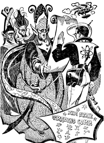 "Is mistaken!" said Jorgenson bitingly. "He's wrong! The Rim Stars Trading Corporation does not want to give him anything! What he has said is not true!" This was the equivalent of treason, blasphemy and the ultimate of indecorous behavior toward a virgin Pelean princess. "I won't give him anything! I'm not even vanishing from sight! Glen-U is wrong about that, too! Now—git!"