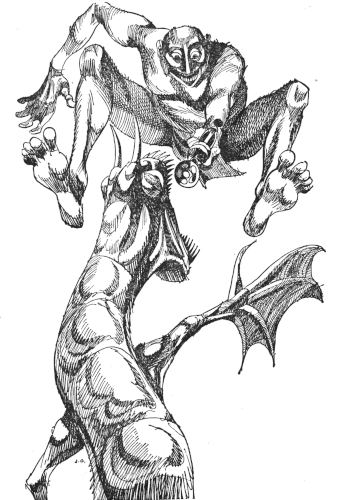 When she was astride his back Asa checked his compass and started jumping. At once he knew that the going would be much harder than he had imagined. Alone he could leap twenty-five yards, but her weight cut him down to about five yards. He kept going, realizing that the task was almost beyond his strength and not daring to tell her that even if his strength held out they might not even find the settlement in this drizzle.