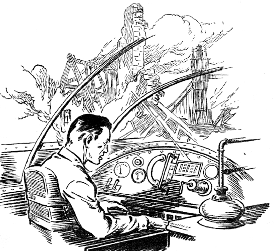 The path, too, was strewn with rubble and beyond the path a black, pitted hole yawned among the broken, uprooted trees that had been the orchard—was it only a few minutes ago? Darville rubbed a hand across his face, pulling roughly at his cheeks with thumb and fingers. Instinctively he wheeled toward the booming reverberation of the Channel, toward the costly Ploving Laboratories that were his goal.