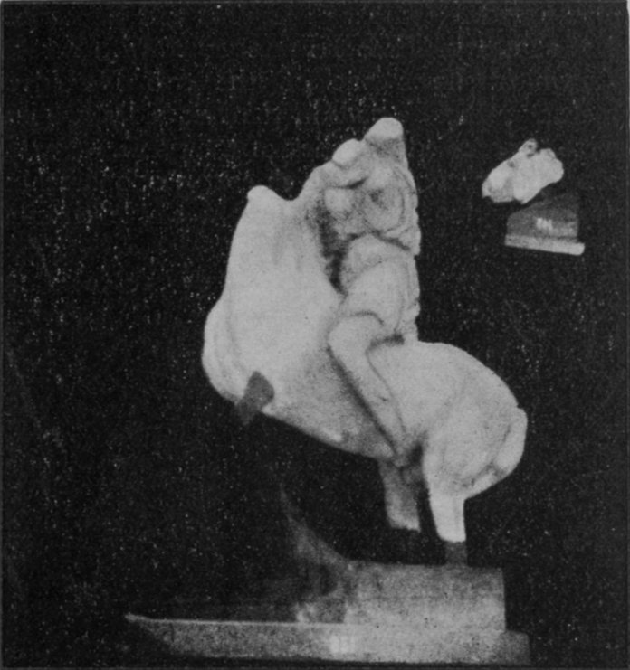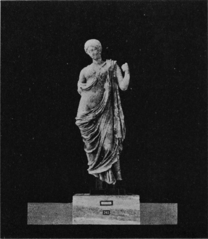 Gold and ivory were beautiful materials for the sculptor, though involving much difficulty when combined. The disappearance of all attempts at chryselephantine sculpture in modern times is perhaps due to this difficulty in production and to the cost, but probably more to the fact that the ivory usually tended to crack. The great figure of Athena in the Parthenon needed, we know, to be frequently moistened on its ivory surface with water. At Olympia, oil was applied to the great figure of Zeus, but curiously enough the Asklepios at 8 Epidauros needed neither. As the god of medicine, it may be supposed that he was able to preserve his own integument, but Pausanias tells us that a well, beneath the pavement of the temple, diffused sufficient moisture to prevent contraction and cracking of the ivory.[2]