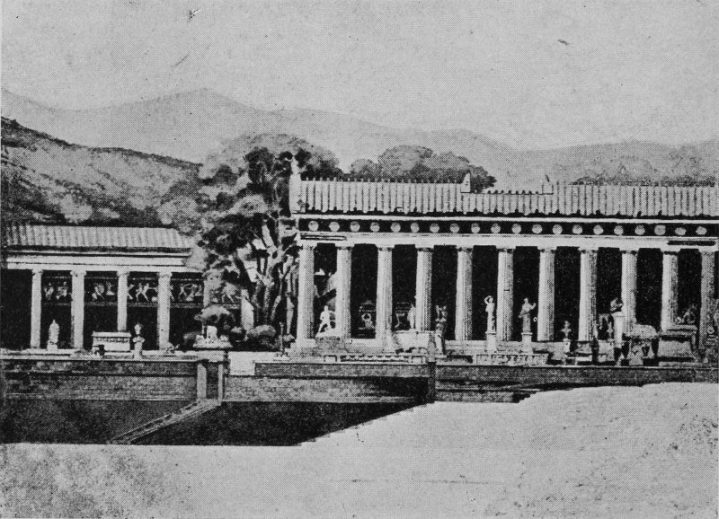 The Tholos or Thymele, shown at E in Plate I and in the annexed restoration by Defrasse, Plate X, was probably the most beautiful circular temple that the Greeks ever built, far surpassing the Philippeion at Olympia. It was built in the fourth century B.C., by Polykleitos the younger, and took twenty-one years to build; externally it presented a beautiful doric colonnade, with peculiarly rich cornice, coloured. Within was a circle of sixteen graceful Corinthian columns of marble; the wall and floor were also decorated with variously coloured marbles. Here were two celebrated paintings by Pausias, the 11 Greek artist; the first represented Methe (drunkenness), a woman holding a large wine goblet to her lips, the glass of which was so painted that the face was seen through, or reflected in it. The second, a picture of Eros (love) laying aside his bow and quiver and taking up his lyre, a less dangerous weapon. Perhaps we may suppose that the painter here indicated the relation of Bacchus and Venus to the ailments which afflict mankind. The scourges which we are told the gods make out of the pleasant vices of men doubtless often brought the wealthy Greek as a suppliant to Asklepios.