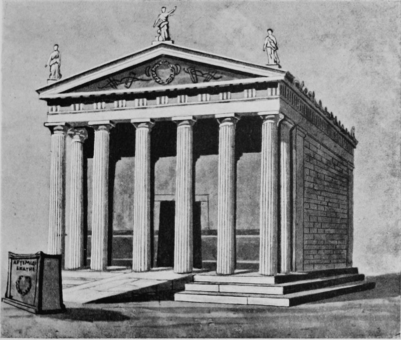 Plate I, Letter F. The Temple of Artemis is smaller than that of Asklepios (see Plate XII); the eaves were decorated by a rich cornice of sculptured heads of dogs, the attribute of Artemis-Hekate. She, the sister of Apollo, was a divinity of healing and succour, the chaste moon goddess, who healed Æneas. Acroteria of Victories decorated the eastern gable; 14 within was a row of marble columns, and externally stood a triple figure of Artemis-Hekate, and an altar.