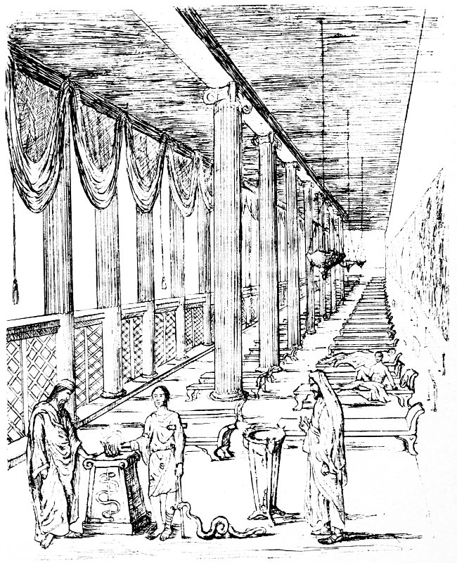 Although considerable interest is felt by the English public in regard to much of the work just referred to, one important field of investigation has remained comparatively unknown in this country—I mean the exploration of the shrines of Asklepios, the god of healing, at Epidauros and Athens, about which I am to have the honour of speaking to you. As the time allotted is brief, it is needful to avoid all prefatory remarks, and to restrict this paper almost entirely to a consideration of the new discoveries and to inferences from them. As a matter of fact, apart from the Hippocratic writings there is but scant information as to the sanitary and medical aspects of Greek life in ancient literature. Homer and Pindar have brief references to Epidauros and other sanctuaries of the god; so also have Plato, Hippys of Regium, Strabo, and some of the dramatists, as Aristophanes, and certain of the late Greek writers, especially Pausanias. Under these circumstances most precious are the researches made by the spade.