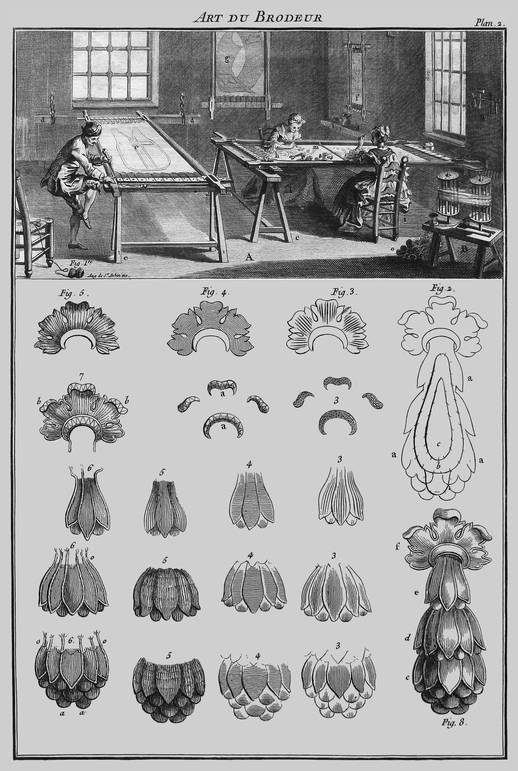 Chez les premiers Romains, la Broderie consistoit en des bandes d’étoffe découpée, dont on chamarroit la bordure des habits[c]; ensuite vint l’imitation de la feuille d’Acanthe, dont on forma des rinceaux; puis petit à petit on a cherché à imiter tous les objets que présentent l’Art & la Nature.