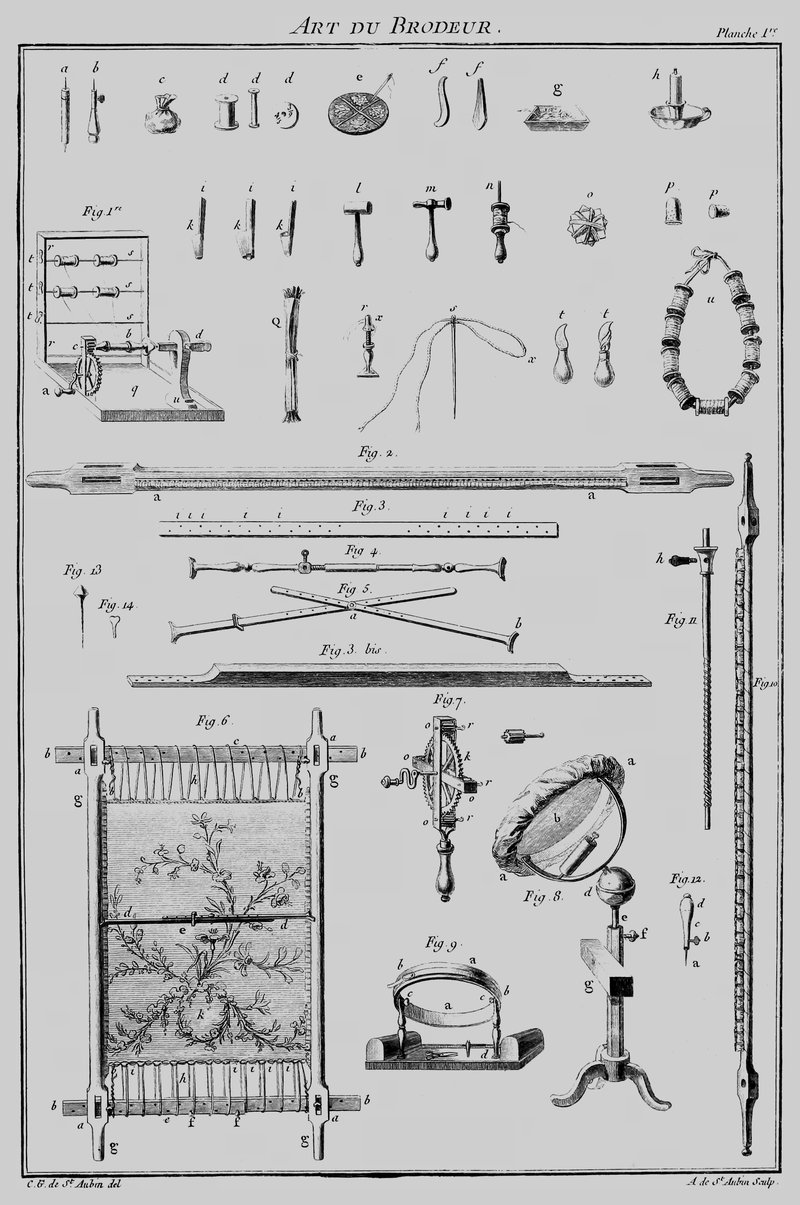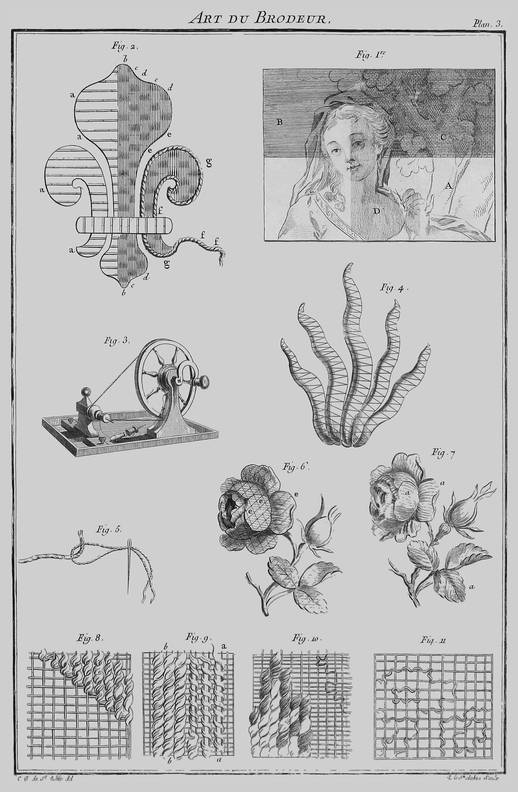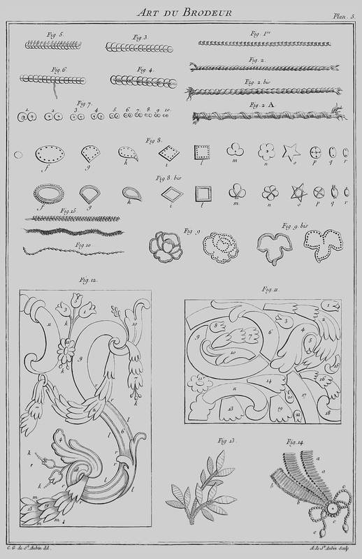 On brode en ronde-bosse, en bas-relief, en or nué, en passé, en passé-épargné, en guipure, en Broderie de rapport, en couchure, en gaufrure, en satiné, en paillettes, en taillure, en jais, en soie, en chenille, en laine, en tapisserie, en chaînette, en Broderie de Marseille, en nœuds & en blanc. Nous allons expliquer séparément toutes ces différentes manieres de broder, dont plusieurs se trouvent souvent réunies dans un même morceau d’ouvrage.
