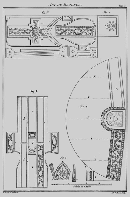 [k] On brode ensemble une moire cramoisie & une moire blanche ou verte, en les appliquant l’une sur l’autre, cela donne deux Chapes ou Chasubles, avec les frais d’une seule Broderie.