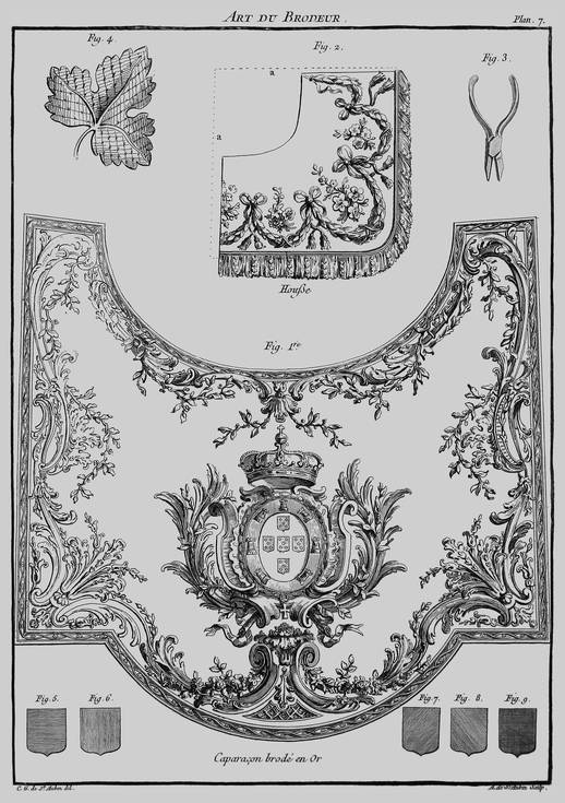 Quand on a exécuté les différents sujets d’un grand morceau, composés chacun de plusieurs petites parties, on les découpe, on les rapporte sur leur vrai fond, suivant que le dessin qu’on y a tracé l’exige, comme le Caparaçon de la Planche 7. Les queues & choses mignones, se brodent sur le fond même: on le nétoie, on le met en taille, on le colle, & l’ouvrage est fini.