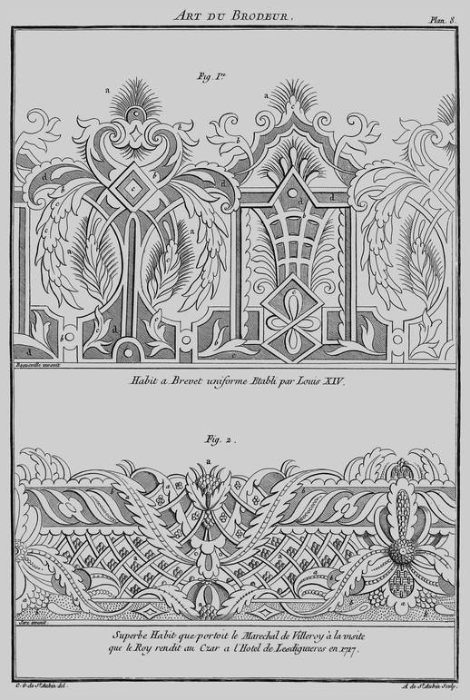 On a long-temps brodé les fonds de galons & autres parties sourdes en cordon passé, ce qui faisoit très-bien jouer les différents objets, & mettoit des repos, comme Pl. 8, fig. 1 & 2; mais aujourd’hui on veut tout brillant, & le cordon est relégué aux Frangers.