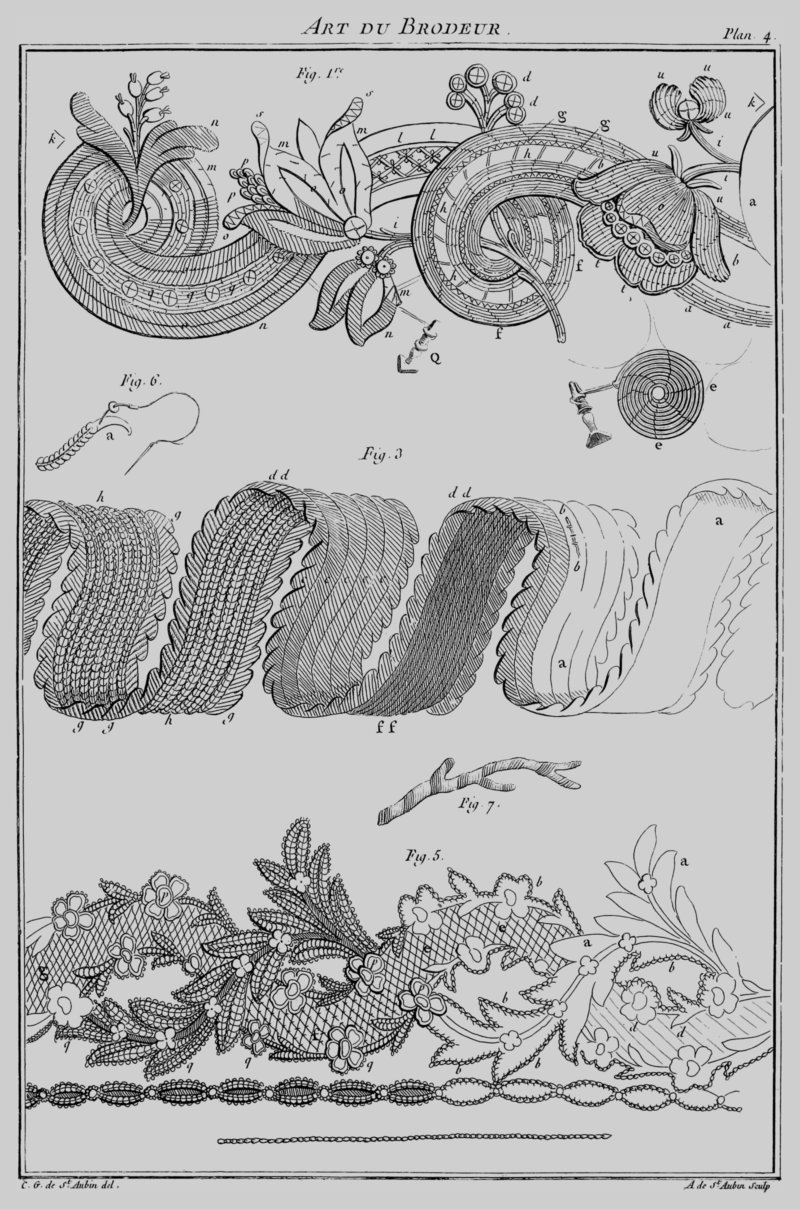 Tout ce qui se brode par parties détachées sur de petits métiers, pour être ensuite rassemblé l’un sur l’autre, & prendre plus ou moins d’élévation, s’appelle du rapport; mais on entend communément par Broderie de rapport, les bordures d’habits d’homme, compartiments de jupes, brandebourgs & autres morceaux que les Brodeurs tiennent en magasin, prêts à être appliqués sur tel [p. 17] fond qu’on voudra. On commence, après que le dessin est ordonné sur taffetas, toile ou papier jaune, par profiler tous les contours extérieurs avec une chaînette d’or, nommée pratique, & cousue à petits points de soie, comme b, b, b, Pl. 4, fig. 5; ensuite s’il y a quelques fleurs ou compartiments qu’on veuille traiter légérement, on applique des bandes de réseau fait au boisseau, comme g, g, que l’on fixe par des points de soie dans les fleurs qui le bordent, & qui cacheront & recouvriront ces points quand elles seront brodées. Quelque fois les Ouvriers font eux-mêmes leur réseau sur la place même, par des points lancés & recroisés, qui n’entrent dans l’étoffe qu’aux endroits qui doivent être recouverts de Broderie, comme d, d; ce procédé est bien plus long, mais aussi il est plus délicat & plus exact. Ensuite on brode le passé si le dessin l’exige; on applique les fleurs de paillons p, p, p; on les guipe avec la frisure ou le bouillon, en laissant toujours déborder un peu de la pratique q, q; on fait les feuilles h, h, en paillettes comptées; les tiges i, i, en frisure guipée, toujours en laissant déborder à peu-près la moitié de la pratique. Quand le morceau est tout brodé, bien nétoyé, collé, séché, on le découpe avec des ciseaux pour ôter tout le fond qui paroît, même celui qui est sous le réseau, à moins qu’on n’ait mis sous ce réseau en commençant à travailler, un ruban d’argent ou de nuances: on peut même ajouter ce ruban après que la Broderie est découpée. Quand elle est ainsi dégagée de tout son fond, on la pese pour en savoir au juste la valeur; puis on la bâtit communément sur du papier bleu, pour la serrer en attendant qu’on la vende. Cette Broderie se vend depuis 18 jusqu’à 36 livres l’once, suivant le prix des matieres dont elle est composée. La pratique dont l’Ouvrier a d’abord profilé son ouvrage, sert à ficher le point sans gâter la Broderie, quand on veut l’appliquer sur telle ou telle étoffe. Les Lyonnois, au lieu d’une pratique, ne liserent leur Broderie en rapport, que d’un frisé en deux, ce qui est moins solide. Il se fait des Broderies de rapport en guipure, satiné, clinquant ou nuances, même en chaînette, tant on a trouvé commode de pouvoir avoir en vingt-quatre heures, ce qui ne peut se broder qu’en un mois. Les Broderies de rapport ont encore l’avantage de pouvoir être transportées successivement sur des fonds différents.