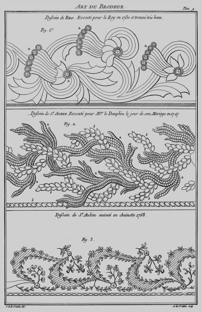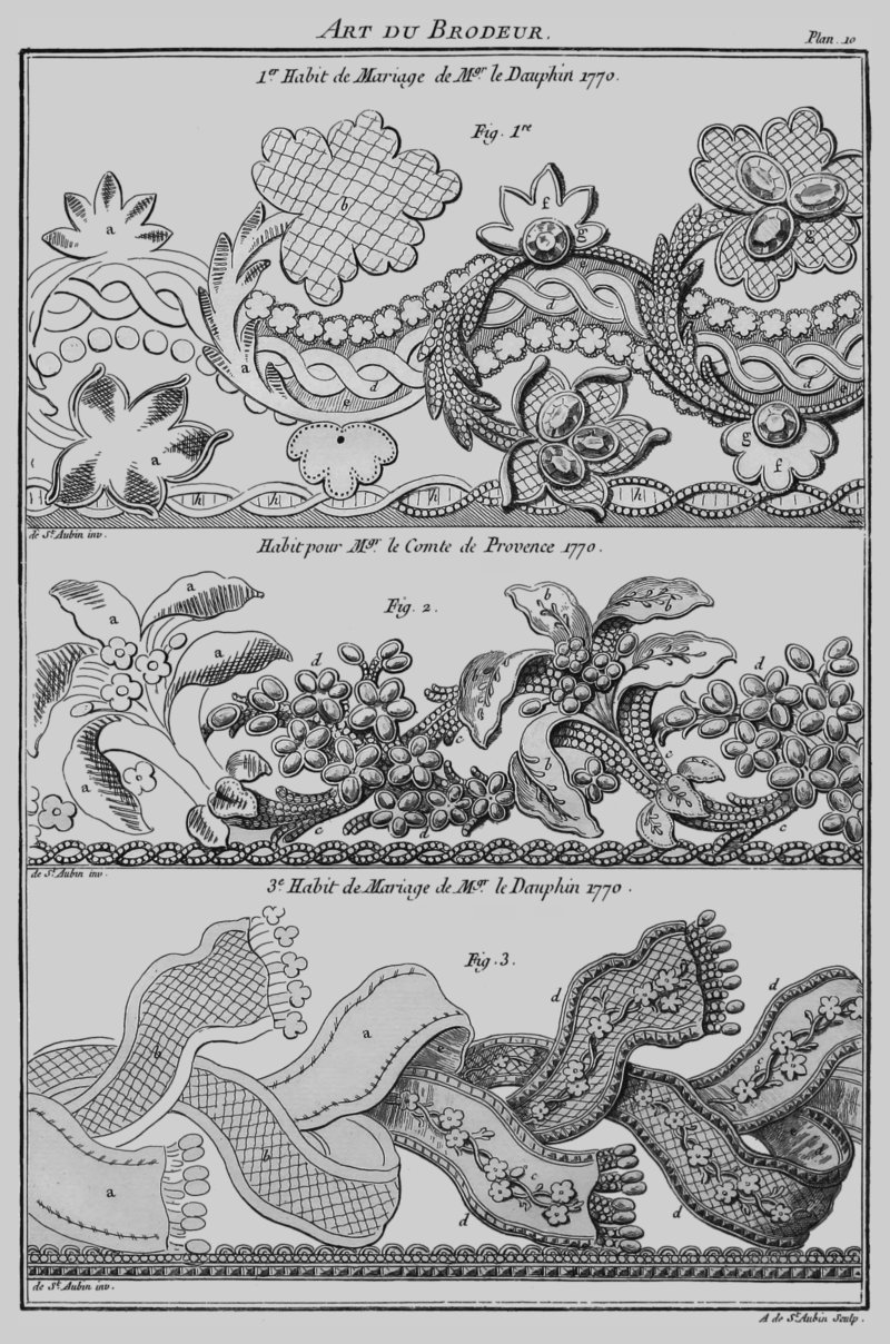 [d] En France, la Broderie succede aux fourrures sous Philippe le-Bel. Loi de 1315, qui défend la Broderie, excepté pour les Princes du Sang Royal. Henri II. permet seulement les bordures d’habits brodées en soie.