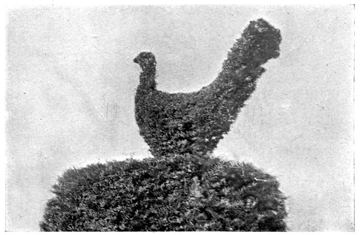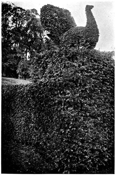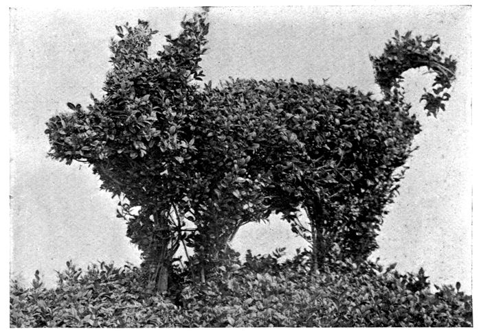 Mr G. Nicholson, F.L.S., V.M.H., in his celebrated “Dictionary of Gardening,” writes, under Topiary, “Although the absurd fashion of cutting and torturing trees into all sorts of fantastic shapes has, happily, almost passed away, yet, as the art of the Topiarist was for a considerable period regarded as the perfection of gardening, some mention of it is desirable here. When the fashion first became general in Britain, it is probably impossible to ascertain; but it reached its highest point in the sixteenth century, and held its ground until driven out of the field in the last (eighteenth) century by the natural or picturesque style. From an archæological point of view, it is not to be regretted that examples of Topiary work on a large scale still exist in several British gardens.” Turning to the very recent “Cassell’s Dictionary of Gardening” an all too concise account is found, but Mr W. P. Wright admits therein that Topiary “finds favour in many quarters to-day, although it only differs in degree and not in principle from the best examples of the Topiary art of the sixteenth century.”