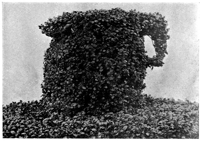 In the Topiary garden, the variety of shapes that it is possible to train are so many and varied that I will only give a few of those that can either be copied from the old gardens, or formed from the Topiarist’s own ideas. In the first instance, there are the various shapes of the figures required in the game of chess. Birds of any description are easy to form into shape in either yew or boxwood. When they are well trained and properly shaped, nothing has a better appearance in the Topiary garden than the various shapes of birds. The shaping of animals is more difficult to manage; but I have seen some 66good specimens, notably a lion and crown, the Howard crest, that we have got in the garden here at Levens. Then there are the various other shapes that are to be found in the old Topiary gardens, such as barristers’ wigs, Indian wigwams, summer-houses, helmets, busbys, bottles of almost any description or size, umbrellas, hats or spirals of various forms. These may be either trained as single trees, or formed into arches. Among the newer shapes that I have seen, which have recently been introduced into the Topiary art, are yachts, boats, jugs, etc. The different sizes and shapes of jugs are so varied, that any person who fancies the training of them in his garden need not lack variety of form, and they are shapes that are, comparatively speaking, very easy to train. There are also a great many very pretty shapes that can be formed out of the yew or the boxwood tree without being intended to represent anything in particular, further than that they are trained and shaped simply as ornaments to help to add further to the embellishment of the garden.