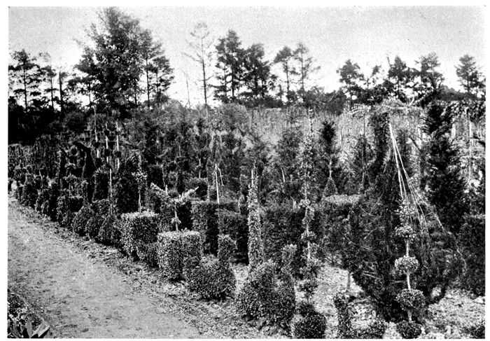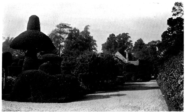 The principle of associating like with like is gaining ground, and in numerous fine establishments the interest of the place is wonderfully increased and extended by gardens devoted to certain subjects. We have Rose Gardens, Rhododendron Gardens, Bamboo Gardens, Michaelmas Daisy Gardens, etc., and lastly, we have Topiary Gardens. These latter do not now as heretofore overpower everything else; they are simply part of a whole scheme for providing a continuation of pleasure, beauty and interest; they serve as a reminder of a quaint stage in the progress of horticulture, and show what a wonderful vitality is possessed by yew, box, and some few other evergreen shrubs.