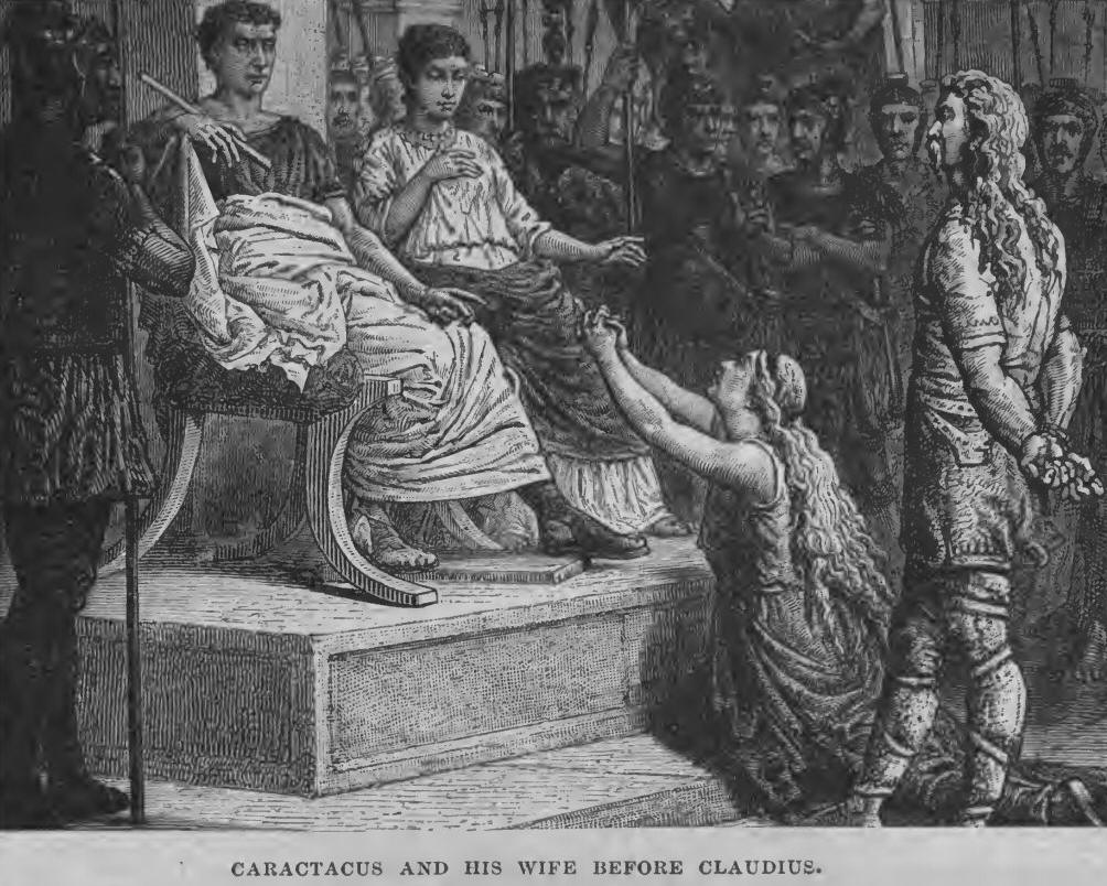 Thirty battles fought by Aulus Plautius were insufficient to reduce Caractacus. Ostorius Scapula was the first to succeed in establishing on the Severn a line of forts separating from the rest of the island the country, now become Roman, which comprised nearly all the Southern tribes. The Britons, who appeared to be subdued, were disarmed. But a new insurrection soon broke forth. The Iceni, who occupied the country now known as the counties of Norfolk and Suffolk, were the first to rise. The Cangi followed their example; and in order to reduce them the Praetor was compelled to pursue them as far as to within one day's march of the sea which separates England from Ireland. From the territory of the Brigantes, which embraced a portion of the present counties of Lancashire and York, Ostorius hastened to invade the Silures, who inhabited the southern portion of Wales, and who were always the most indomitable opponents of a foreign domination. "Behold the day which is to decide the fate of Britain!" exclaimed Caractacus at the sight of the Romans. "To-day begins the era either of liberty or eternal slavery. Remember that your ancestors were able to drive back the great Cæsar, and to save their liberty, their life, and their honor!" He spoke in vain. The naked breasts and bare heads of the Britons could not resist the broad swords of the Roman soldiers. The massacre was horrible. The wife and the daughter of Caractacus were captured, but the chief himself had disappeared. Hoping to renew the struggle, he had taken refuge with his mother-in-law, Cartismandua, queen of the Brigantes. She delivered him up to the Romans. {16} Caractacus was sent to Rome with his family. "How can men who possess such palaces make such efforts to conquer our miserable hovels?" exclaimed the British hero, while traversing the streets of Rome. He appeared before the tribunal of the emperor. Agrippina was there by the side of her husband. The wife of Caractacus threw herself at her feet, imploring her pity; but the conquered chief asked for nothing, and exhibited no sign of fear. This greatness in defeat penetrated to the heart and to the sluggish mind of Claudius. He gave the order to set the captives free. Tradition states that he even restored to his prisoner a portion of his territory, but Tacitus does not mention this; he leaves the story of the vanquished chief at the point where the fetters fall from his hands.