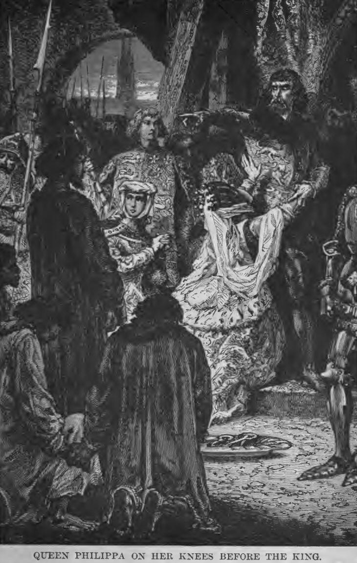 Queen Philippa had thrown herself on her knees, "crying so tenderly with compassion that she could not support herself." "Ah! gentle sire," she said, "since I crossed the sea in great peril, I have asked nothing of you; to-day I beg of you as a gift for the Son of the Holy Virgin and the love of me, that you will have mercy on these six men." The king waited a short time before speaking; he eyed the good lady his wife. "Ah! lady," he said; "I should be but too pleased were you elsewhere but here. You beg so earnestly that I dare not refuse you, and, although I do so with difficulty, take them; I give them to you; do with them as you please."