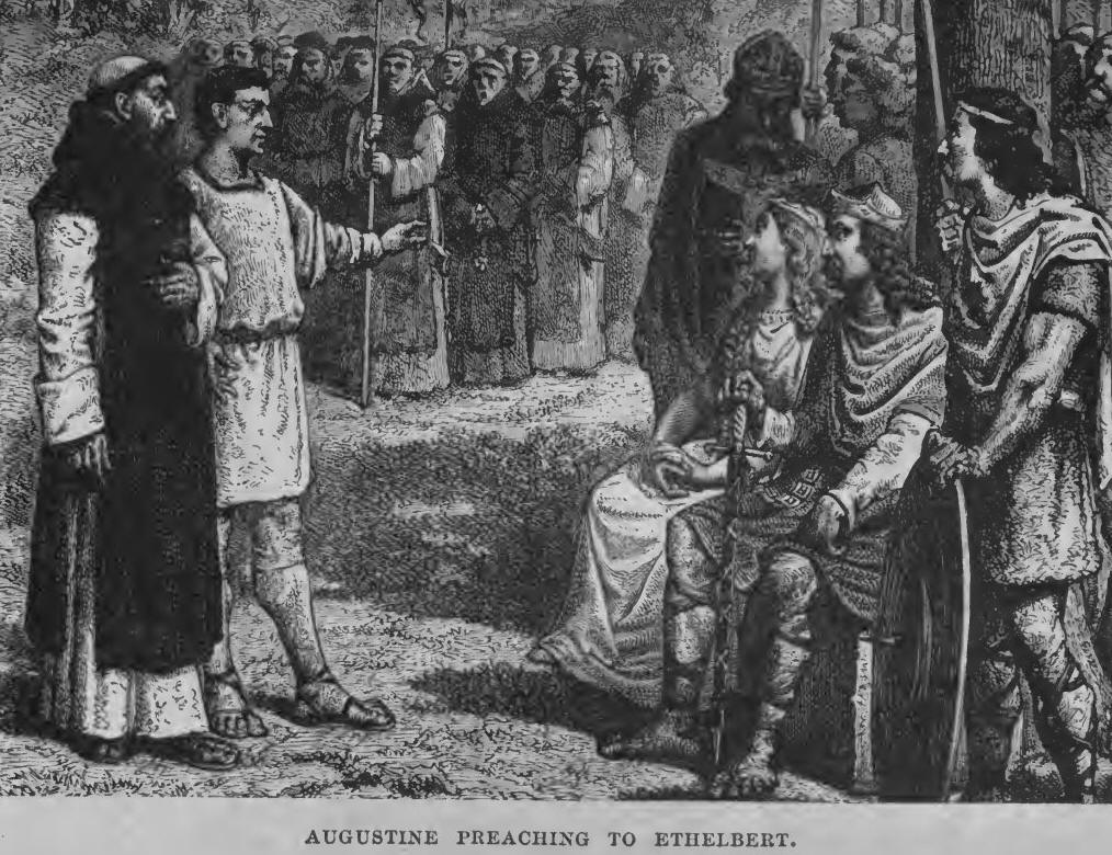 {31}The place could not have been better chosen. A powerful prince in his domains, Ethelbert was their Bretwalda, or general chief of all the Heptarchy. This title, which was in no way well defined, but which conferred a certain influence in the counsels of the seven Saxon states, seems to have been accorded to a kind of merit understood by all. Two chiefs had already borne it before Ethelbert— Ella, first king of Sussex, and Ceawlin, king of Wessex. The new Bretwalda was a pagan, but he had married a Christian wife, Bertha, daughter of Charibert, king of Paris: she had reserved to herself the free exercise of her religion; a French bishop had even accompanied her. Ethelbert had no repugnance towards Christianity and he consented to receive the Roman missionaries. "Be careful to grant them an audience in the open air," said the pagan priests, however; "their maledictions will be less powerful there than under a roof." It was therefore in the open field that the Saxon Bretwalda awaited the approach of the Christian priests. They advanced bearing a crucifix and a banner on which was painted the image of the Saviour. They made the air resound with their grave canticles. The imagination of the barbarians was no doubt struck by these ceremonies, and when Augustine by the aid of an interpreter, had explained to the king the leading doctrines of the Christian faith and asked permission to preach to his subjects the religion which they had come to proclaim to him, Ethelbert mildly replied, "I am not disposed to abandon the gods of my fathers for an unknown and uncertain faith; but since your intentions are good and your words full of gentleness, you can speak freely to my people. {32} I will prevent any one interfering with you, and will furnish food to you and your monks." Augustine overjoyed, directed his steps towards the neighboring city of Canterbury, which he entered chanting, "O Eternal Father, we supplicate Thee according to Thy mercy turn Thy anger from this city and from Thy sacred place, for we have sinned. Alleluia!"