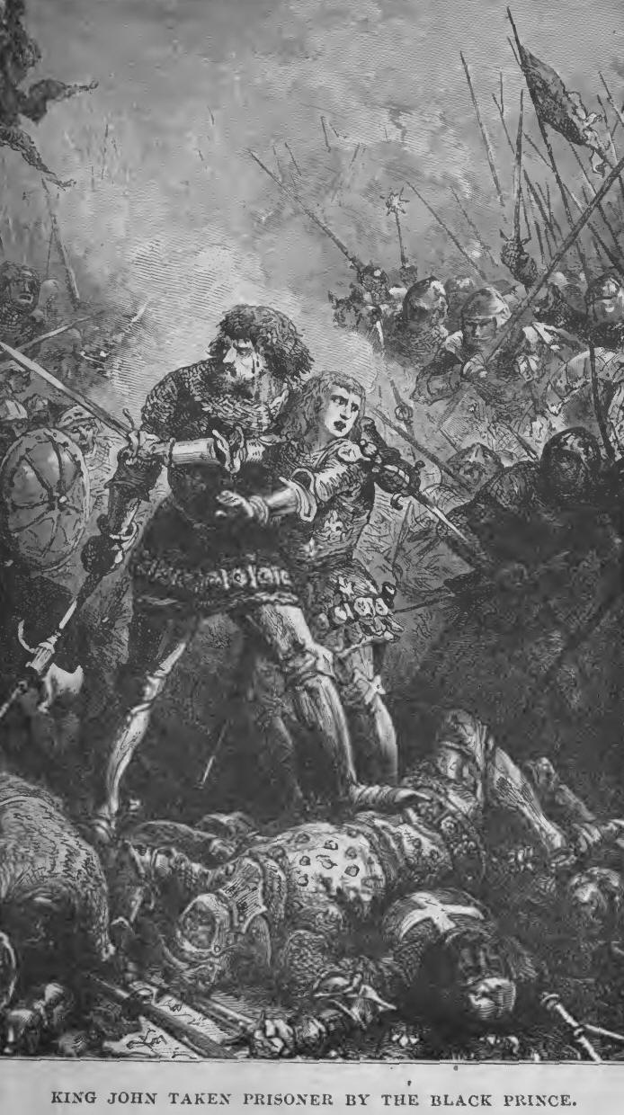 The French had wavered; a great number had remained on horseback, against the advice of Ribaumont. A good English knight, Sir James Audley, awaited them foremost in advance, having vowed to be the best combatant in the battle. The heavy cavalry and the warriors, covered with steel, entered the narrow path leading to their enemies. The arrows of the English archers began to whistle by; the brave knights looked around them; they saw no assailants, but they were wounded and their horses were falling. They were obliged to retreat, leaving the dead, the dying, and the wounded horses, who encumbered the defile. The army corps of the marshals was disconcerted, and that of the Duke of Normandy was beginning to take alarm. The experienced eye of Sir John Chandos was not deceived in the matter. "Ride forward, sire," he said to the Prince of Wales, "for the day is yours. Let us devote ourselves to your adversary, the King of France; for there lies the greater part of the day's work, and I well know that by reason of his valor he will not fly." The prince applied his spurs to his horse, and quitting his rustic rampart, he advanced into the open space where the King of France was fighting. A detachment of the archers attacked at the same time the troops of the Duke of Normandy, who took to flight almost without striking a blow. The English charged, "St. George and Guienne!"—"Montjoie St. Denis!" was the answer around King John; but the disorder was increasing. "The Duke of Orleans had disappeared with the reserve forces. {322} The king was not a man ever to be frightened by the things which he saw or heard said, but still remained a good knight, and fought well." "Dismount! dismount!" he cried to all his followers; and himself alighting from his horse, he marched along their ranks, battle-axe in hand, and there, around him "there was a great number of warriors, haughty and cruel, and many heavy blows were given and received." And the still youthful prince, Philip, was there, crying to his father: "Sire, have a care on your right! Sire, have a care on your left!" and defended him as much as he was able. Meanwhile, on all sides the king was greeted with, "Surrender, or you are a dead man." He looked around him. "To whom shall I surrender?" he asked aloud. "Where is my cousin, the Prince of Wales? If I could see him I would speak."
