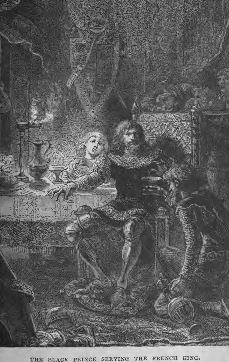 The prince had removed his helmet when the King of France was brought forward, before whom he made a profound reverence and received him as a king, well and wisely, and in the evening he waited upon him without ever consenting to be seated, notwithstanding any solicitation which the king made in this respect, and said that he was not yet sufficiently important to sit down at the table of so great a sovereign and so valiant a man, who had that day surpassed the ablest. "And all deemed that the Prince had spoken well."