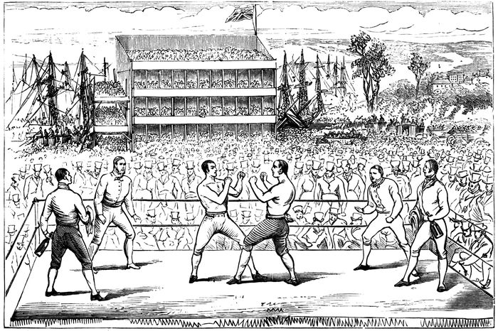 Round 1.—Carter entered the ring with great self-importance, smiling contemptuously upon his opponent, and indicating by his gestures that he had a mere nothing to contend with. Both the combatants appeared in good condition, particularly Spring. Upon shaking hands, Carter did not, as heretofore, let fly with his left hand, and both men sparred for an opening. Spring, at length, planted a hit on Carter’s right shoulder. All eyes were fixed upon the soi-disant Champion, to see him go to work, almost expecting him to annihilate his opponent. A long pause occurred, and the men appeared more like statues than living pugilists in actual combat. Spring broke from his position, and planted another hit upon Carter’s shoulder. The latter endeavoured to make a blow with his left, which was well stopped by Spring, who also fought his way into a close; Carter got him on the ropes, where a terrible struggle occurred for the throw, and, amidst much hissing and hooting, Carter got Spring down.