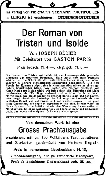 Der Text wurde in Frakturschrift gedruckt, mit Ausnahme der Buchanzeige für ‚Der Roman von Tristan und Isolde‘ von Joseph Bédier, welcher komplett in Antiquaschrift erscheint. Dies wurde hier nicht separat ausgezeichnet, ansonsten werden Passagen in Antiqua kursiv dargestellt. Abhängig von der im jeweiligen Lesegerät installierten Schriftart können die im Original gesperrt gedruckten Passagen gesperrt, in serifenloser Schrift, oder aber sowohl serifenlos als auch gesperrt erscheinen.