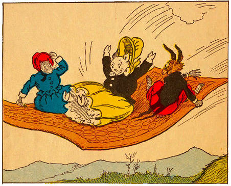 8. “Mrs. Twistytail! Mrs. Twistytail! This way if you please!” called Nurse Jane, when the lady pig, lovely and fat, was up in the air again, above the rug. “Fall here, Mrs. Twistytail, and you’ll help bear us to the earth!” Mrs. Twistytail squealed: “Quee! Quee! I’ll do my best,” she grunted. And down she fell, landing on the sailing rug, safely between Uncle Wiggily and Nurse Jane. Down they went!