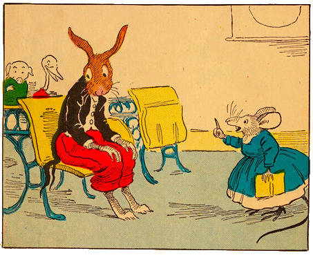 4. “I’ll ask you to come up and sit in the front seat, Uncle Wiggily,” squeaked the Lady Mouse Teacher sadly. “You said you wanted to come here to show my pupils how to be good in school, but you are cutting up worse than any of them ever did.” So the bunny gentleman took his place in the punish seat. But still he wouldn’t tell that Jackie had first hit him with a bean. Uncle Wiggily was a “SPORT,” I think.