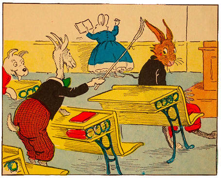 1. One day, as he was hopping through the woods, Uncle Wiggily met Curly and Floppy Twistytail coming from school with their books. “Why are you so late coming from school?” asked the bunny. “We were kept in,” grunted Floppy. “For being bad and having fun,” squealed Curly. “Tut! Tut!” scolded Uncle Wiggily. “You should be good in school. Tomorrow I’ll go to school and show you how.”