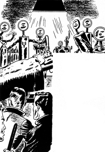 "What—!" he finally quavered. But his voice was only a shrill whistle. The machine moved closer and the arm-like metal rods shot out, adjusted a small dial upon his drum. And he could speak....