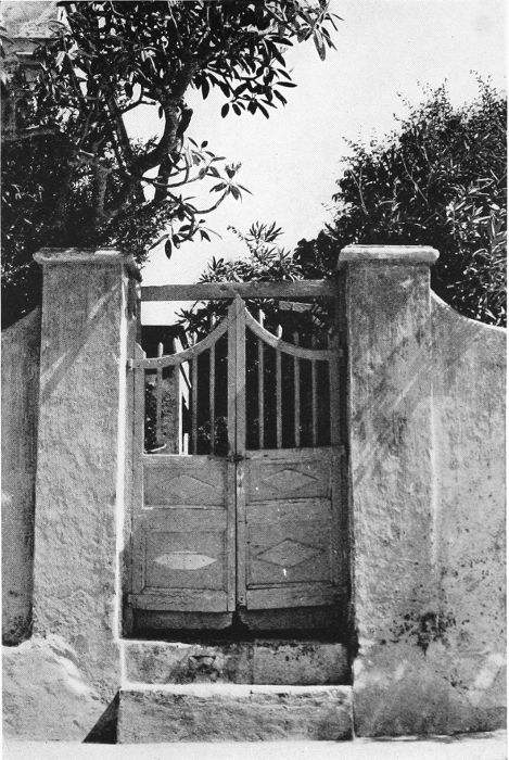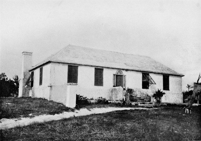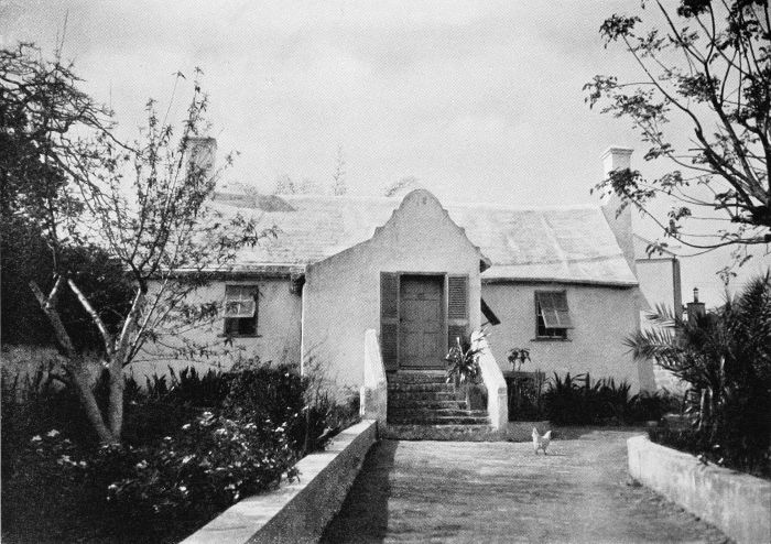 To those who are familiar with Bermuda and the houses there, these colorless photographs may be but sorry representations of the actuality, and can only serve to stimulate memory. White, or softly tinted houses with weathered green blinds and doors, frequently buried in luxuriant foliage and blossoms of vivid hues, with glistening white roofs silhouetted against intensely blue sky, or backed against the dull green of red trunked cedars, through which may be glimpses of a turquoise sea, make a strong impression on the senses, but fail to register with the camera—even when held by a more experienced hand than that of the author.