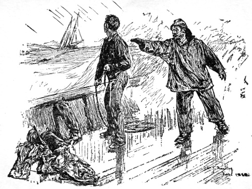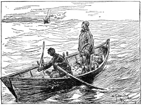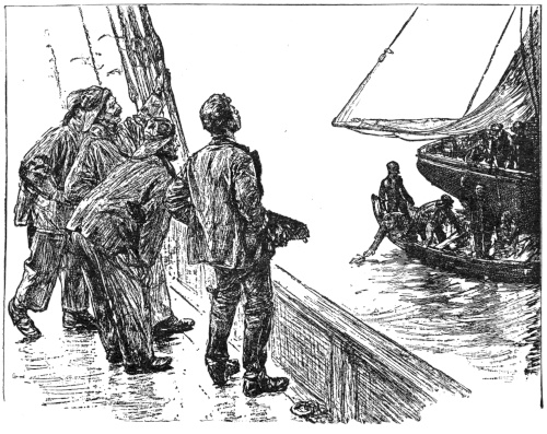 The cook, or “doctor,” as he is almost always called on 17board the fishing schooners, and, in fact, on most vessels, was a short, thick-set Portuguese, almost as dark as an Indian, but the very picture of good-nature. He now stepped up behind the skipper so as to have a good view of the baby, whose face, which rested on the skipper’s shoulder, was turned away from the crew, who stood looking at him in a helplessly bewildered way.