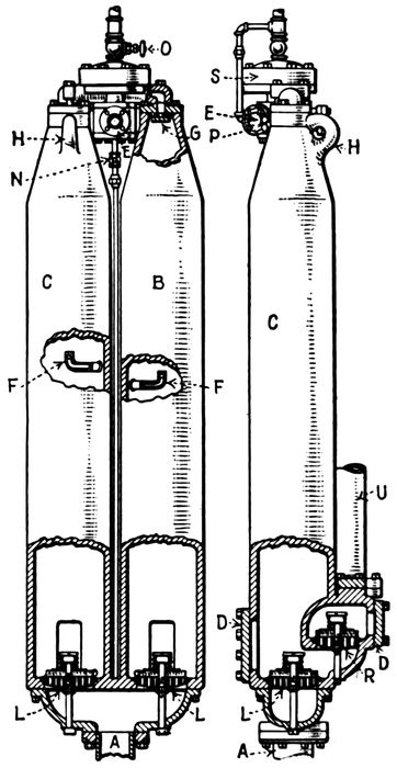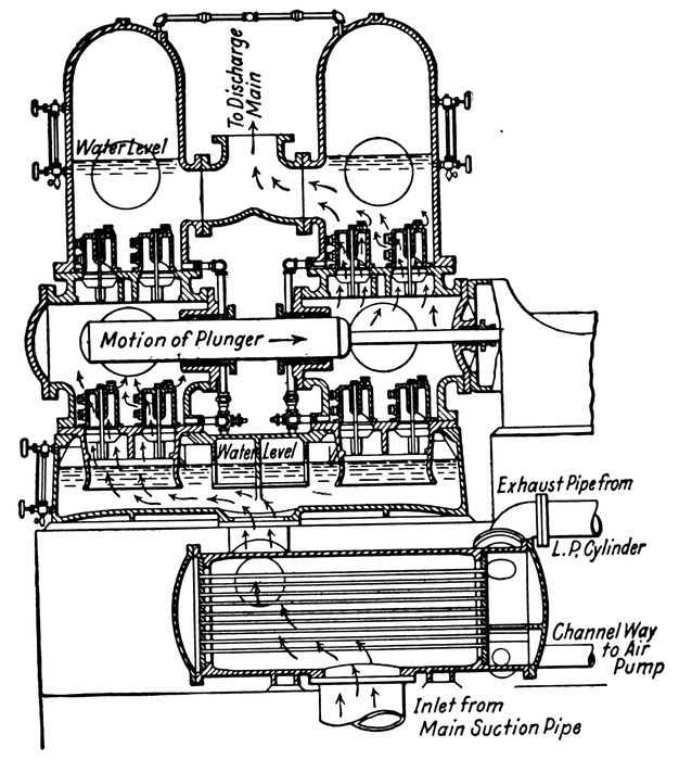 The pneumatic system was introduced by Liernur, a Dutch engineer.[8] It is used in parts of a few cities in Europe, but it is not capable of use on a large scale. It consists of a system of air-tight pipes, connecting water closets, kitchen sinks, etc., with a central pumping station at which an air-tight tank is provided from which the air is partly exhausted. As little water as possible is allowed to mix with the fecal matter and other wastes in order not to overtax the system. Solid and liquid wastes are drawn to the central station when the waste valve on the plumbing fixture is opened.