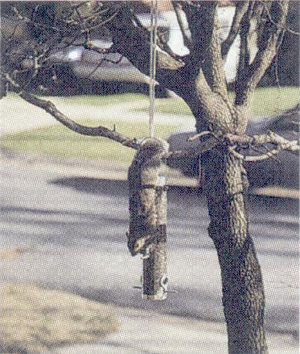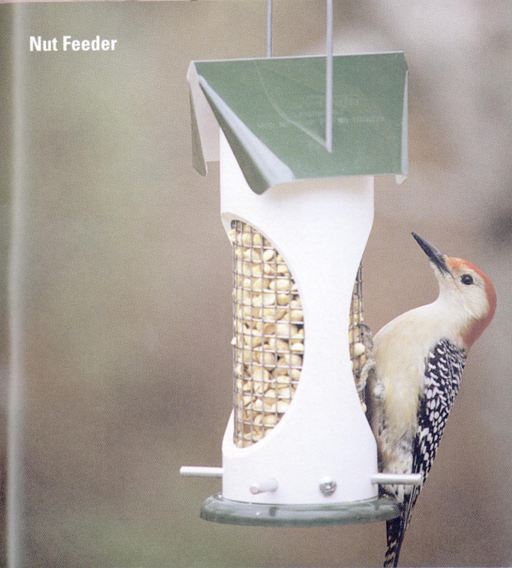 If you must hang a feeder, select a tube protected with metal mesh. Most plastic “squirrel-proof” feeders, despite manufacturers’ claims, may eventually succumb to the squirrels. Any wood or plastic feeder can be effective when mounted on a pole with a plastic or metal baffle, if the pole is at least 10 feet or more from a tree limb or trunk (squirrels can jump great distances).