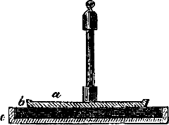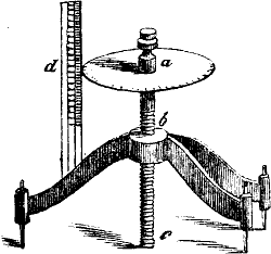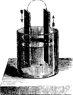 Weil zwei verschiedene Metalle bei gegenseitiger Berührung einander electrisch erregen, und diese Electricität, wenn sie auch so schwach ist, daß sie sonst nicht bemerkt werden kann, doch wenigstens durch ihre Wirkung auf die Geschmacksnerven sich bemerklich macht. Der Geschmack ist sauer, wenn das Kupfer auf der Zunge liegt, laugenhaft, wenn das Kupfer unter der Zunge liegt. Auch auf die Gesichtsnerven macht die Electricität einen Eindruck. Legt man einen Kupferstreifen an das rechte, einen Zinkstreifen an das linke Zahnfleisch der oberen Kinnlade, und bringt man dann die vorderen Enden der Metallstreifen mit einander in Berührung, so empfindet man vor den Augen einen vorübergehenden Lichtschimmer. Man nennt diese durch Berührung verschiedener Metalle erzeugte Electricität Berührungs- oder[193] galvanische Electricität. Daß wirklich Electricität dabei im Spiele ist, kann man erkennen, wenn man zwei mit isolirenden Glasgriffen versehene Metallplatten, die eine aus Kupfer, die andere aus Zink, mit ihren geschliffenen Flächen aufeinander legt und nach der Trennung jede derselben am Condensator prüft. Das Auseinanderfahren der Goldblättchen beweist dann ihre electrische Eigenschaft. Diese Berührungselectricität wurde zuerst von Galvani in Bologna im Jahre 1786 entdeckt, aber erst von Volta in Pavia im Jahre 1800 richtig erkannt.