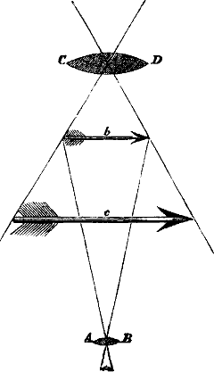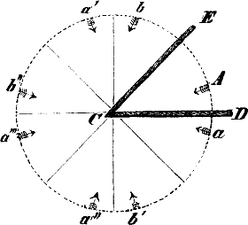 Weil durch die Bewegung des Zeigers auf der ersten Station bei Berührung eines Buchstaben zugleich eine galvanische Kette geschlossen und also ein electrischer Strom durch den langen Leitungsdraht[198] zur entfernten Station geführt wird, hier aber dieser Strom einen kleinen Electromagneten magnetisch macht und ihn dadurch veranlaßt, einen Anker anzuziehen und durch diesen wieder einen kleinen Hebel zu bewegen, der endlich in ein Zahnrad eingreift und dies sammt dem daran befindlichen Zeiger um einen Zahn forttreibt. Sobald der Zeiger auf der ersten Station den Buchstaben oder vielmehr den damit in Verbindung stehenden kleinen Stift verläßt, wird die galvanische Kette geöffnet, der electrische Strom also unterbrochen, und der Electromagnet auf der anderen Station seines Magnetismus beraubt, so daß der Anker wieder fällt, und das Zahnrad mit dem Zeiger still steht. Das Wesen des electrischen Telegraphen beruht also einmal auf der außerordentlichen Geschwindigkeit des electrischen Stromes, die auf 150000 bis 450000 Kilometer in der Secunde geschätzt wird; dann auf der Leitungsfähigkeit der Metalle und des Erdbodens, da der Strom von der einen Station zur zweiten durch einen Kupfer- oder starken Eisendraht geleitet wird, von jeder der beiden Stationen aber in die Erde als Leiter abströmt; endlich auf der Möglichkeit, in jeder Entfernung vermittelst des durch eine Drahtspirale geleiteten electrischen Stromes ein Eisenstück nach Belieben magnetisch zu machen und ihm diese Eigenschaft wieder beliebig zu nehmen.