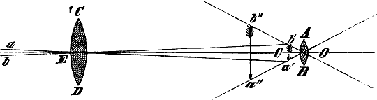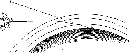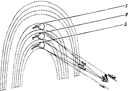 Weil der Blitz, indem er von Wasserbläschen zu Wasserbläschen überspringt, beständig durch plötzliche Erhitzung die Luft[191] aus der Stelle treibt und darum vor sich her verdichtet, die dichtere Luft aber die Electricität nun weniger gut leitet, und der Blitz so veranlaßt wird, immer wieder vom graden Wege abzugehen und sich seitwärts in weniger dichter, also besser leitender Luft einen Ausweg zu suchen.