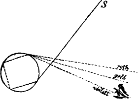 Weil die Cohäsionskraft in Flüssigkeiten sehr schwach ist und[12] schon die Schwere hinreicht, den Zusammenhang ihrer Theile aufzuheben und sie zum Auseinanderfließen zu veranlassen. Nur bei sehr kleinen Flüssigkeitsmassen, die sich bei der Verdichtung von Dämpfen bilden, ist die innere Zusammenhangskraft stark genug, die Schwere zu überwinden. Solche kleine Massen, in denen die Theilchen nur durch innere Kraft zusammengehalten werden, nehmen daher Kugelgestalt an und bilden Tropfen. So fällt der Regen in Tropfen; so ist aber auch die Erde, die ihre Kugelgestalt nur ihrem früheren flüssigen Zustande verdankt, in Wahrheit ein Tropfen im Weltraum.
