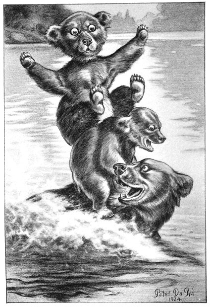 “Snookie, come here!” ordered Mother Brown Bear. But Snookie only whimpered. “Chinook, show your sister that you are not afraid,” she coaxed, and Chinook, with a show of bravado, waded in. But the instant the water was deep enough to start lifting him off his feet, he turned in a panic and again dashed madly back to solid ground.