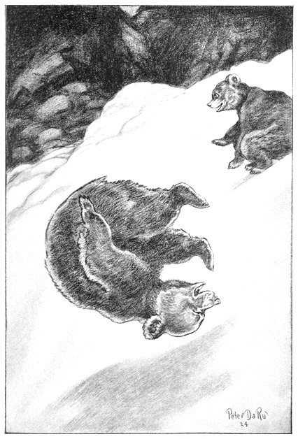 For a while after the Boy had passed out of sight, the cubs were allowed to practise walking on the fallen logs. When they fell off, they were so fat and so round, and the moist ground so soft, that it did not hurt them. Besides, the moment they felt themselves slipping, they could put out their claws and cling to the rough bark. By and by the Boy returned along the way he had come, but by this time Mother Brown Bear had led the cubs far up the gulch to where a spot of sunshine invited a cat nap. Even as she dozed, she kept one eye half open, and one ear cocked for the slightest sound beyond the calling of nestling birds and the barking and scrambling of noisy Douglas and his family, and the tinkling of the wee cascades that led to the river. The cubs rolled and tumbled over her, or coasted off her huge back, boxed and wrestled and played hide and seek, or came up to pat her huge, furry face with little love pats.