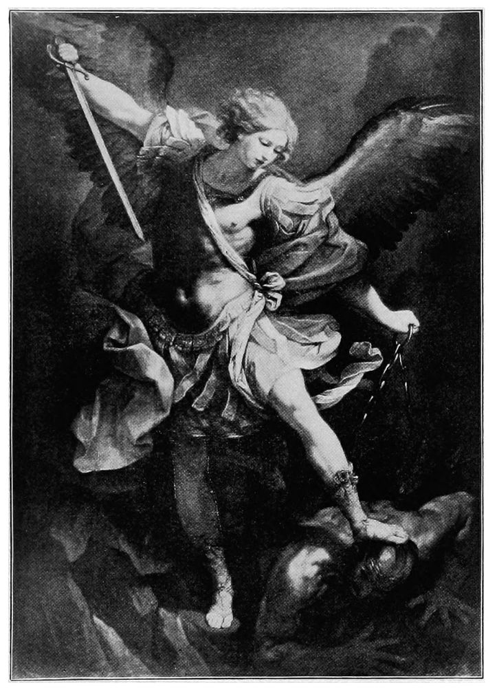 To whom, then, may one look for satisfactory angels? For myself, I answer, to Raphael, and especially to his later works. His angels are sexless, spiritual, graceful, and, at the same time, the personification of intelligence and power, as may be seen in our illustration of the Archangel Michael. Witness also the three angels in the Expulsion of Heliodorus from the Temple, in the Stanza della Signatura, in the Vatican. They are without wings, and none are needed to emphasize their godlike wrath against the thief who robbed the widow and orphan in the very temple of the Most High. The celestial warrior on his celestial steed,—believed to be St. Michael, in his office of Protector of the Hebrews,—the deadly{41} mace drawn back ready to strike the fallen robber, and his two rapidly gliding attendants, with streaming hair and swift, spirit-like movement, are such conceptions and personifications of superhuman power as can scarcely be paralleled in any other work of Art.
