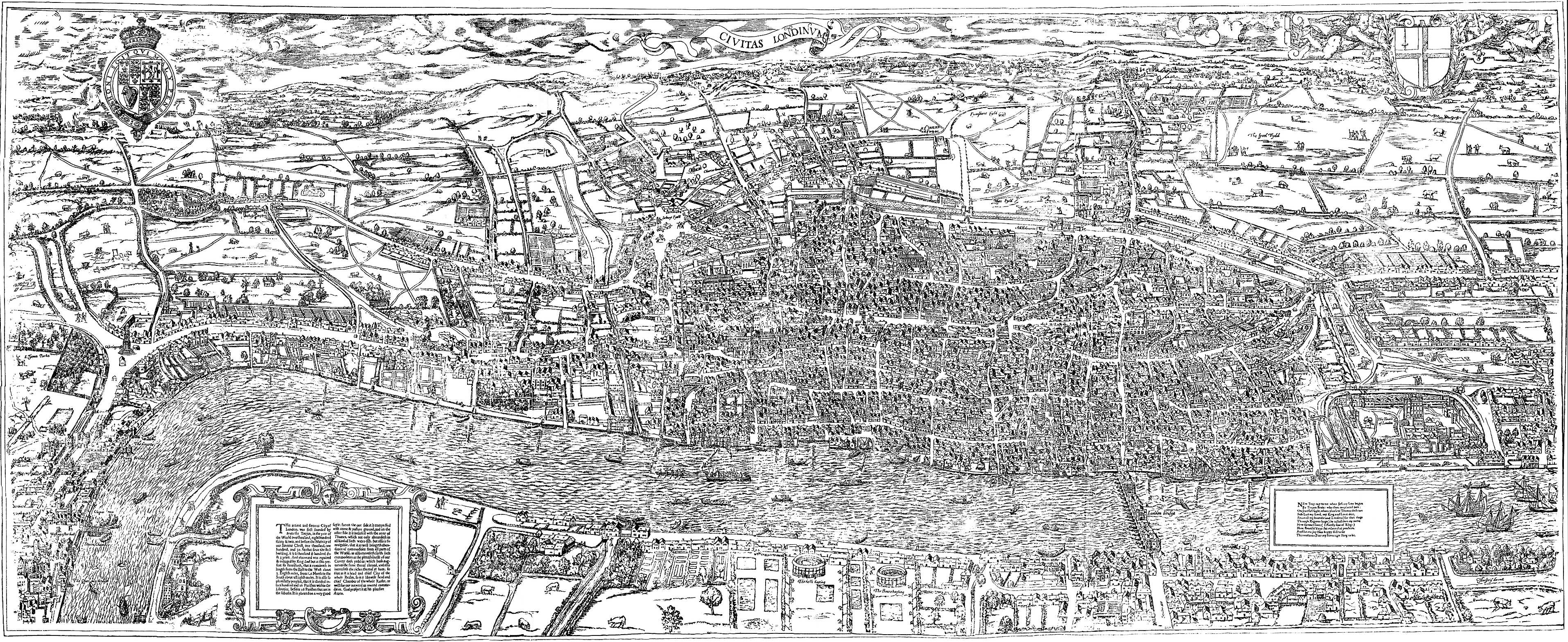 Ralph Agas was born about 1540. He was a land-surveyor, and his chief claim to notice lies in the three maps or plans he made of London, Oxford, and Cambridge. Of these the one reproduced in this volume, entitled “A Survey of the Cities of London and Westminster, the Borough of Southwark and parts adjacent,” was engraved by Edward J. Francis, and edited by W. H. Overall, F.S.A. Mr. Overall made a careful examination of all the facts, and believes that the original map of Agas was not made earlier than the year 1591, though it has been commonly supposed to have been made about 1560. Of the original, two copies are extant—one in the Guildhall, and the other in the Pepysian Collection at Magdalen College, Oxford.