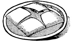 The Scroll is simple to fold. It is represented complete (fig. 3). The bread is under the centre, on which the name card may be laid. It does not require to be stiff. First fold the serviette four times lengthways. Fold down one end in the manner shown at A, in fig. 2. Then fold the end A completely across, forming the line, B B. Roll up the end A, and produce the fig. 3. Treat the other side in the same way. Fig. 3 illustrates the process. The space in the middle, A, fig. 1, is closed over the bread. [Pg 11]