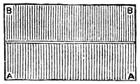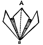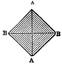 This is one of the easiest methods possible of ornamentally folding a serviette, and we recommend a novice to commence with it. Indeed, we have arranged the folding as progressively as possible. Although it will sit more crisp and fresh in appearance if made with a fine new well starched material, the Escutcheon can be made very well with old or even crumpled damask, though, of course, serviettes should always be scrupulously clean and smooth. First, fold the serviette in half lengthwise; and then fold it in half again lengthwise, keeping the edges to the lower end, which comes where in the diagram A A and B B are marked (see fig. 1). It is necessary to be always very precise in making the folds, bringing the edges and corners exactly to meet, a rule which applies to all the designs; but without strict attention to which, the more elaborate patterns cannot be represented.