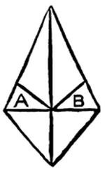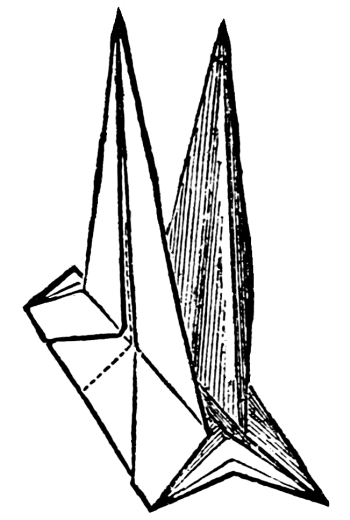 The Mitre is a well-known device, and one which always looks effective. It is not unlike the Crown. Fold the damask in half, and turn down the two corners to meet at both ends, in the manner shown in fig. 1, taking care to let them meet very exactly and not overlap. Fold it in half at the line A to B, fig. 1, to ascertain the centre. Open this last fold again and bring the two points to the centre like [Pg 9] fig. 2. Fold these together at the dotted line with the points outside, let down one of these corners again, and turn in the two points A and B also, to make a triangle uniform with the others: it will now resemble fig. 3. Turn the serviette over; let down the point on that side: it will then resemble fig. 4. Turn in the corners A and B, by the line marked. Turn up the point D to its former position: it will now resemble fig. 5. Slip the hand inside the hollow to be found at the broad end, and shape it like a cap, and the Mitre is complete.