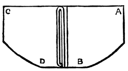 Fold a serviette in half lengthways (see fig. 1), then in half again (fig. 2). Fold it lengthways again, with the edges-inside, in the way shown in fig. 3. Fold it in half lengthways at the dotted line with the edges outside. Turn down the corners in the manner explained by fig. 4, both sides alike; it now resembles fig. 5. Turn in the superfluous end C, shown in fig. 4, inside the hat: this makes it resemble fig. 6. Shape it with the hand and slip it over the dinner bread. If the edges are left outside in folding (fig. 3), when finished, a space will be [Pg 12] offered at the top wherein a few flowers may be placed. A Boat may also be folded by this diagram by reversing its position on the plate. A still better way to make the Boat is to double a serviette in half lengthways, and again the reverse way. Fold the two edges to the centre: this makes an oblong. Turn it over on the other side. Turn two of the corners to meet in the centre; must not be opposite corners, but both at the right end. Turn the two left end corners half to the middle. Iron down. Then fold the whole in half lengthways, having the corners inside. This completes the Boat. Put the bread underneath.