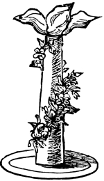 This is difficult to fold, although it may be done with a soft damask. Starch is, however, an improvement. The secret of success depends entirely on rolling it very lightly. Lay the serviette flat on the [Pg 22] table. From A to B (fig. 1), fold down about six inches, if it is a large serviette. After trying the fold once, by reference the illustration, it will be seen if the proportion is properly kept. The one which we have just folded ourselves, as a model, stands fifteen inches high, eleven for the shaft of the column, and it is very erect and firm, although made of limp damask. Fold the damask in half from C to D (fig. 1), to ascertain the half. In the left hand nip up the corner E, as shown in the illustration; the centre C and the corner G in the same way, like fig. 2, shaping them into laurel leaves. Then pleat down the serviette, holding the top still in the hand, in the way described in fig. 3. Next take the end H (fig. 2), that is, the left hand lower corner, and pass it completely round the serviette to the right, bringing the selvage tight around A to B in fig. 3. Lay it on the table, holding the neck at E grasped in the hand, at first; and tucking down and keeping tight the folds from C to D (fig. 4), whilst rolling over the end E to F, as tightly as possible, umbrella wise; pressing it on the table as you roll it up, to keep it firm. Fasten the end with a little pin. Then firmly tuck in the odd corners at the base, in the way half a pound of sugar or an ounce of almonds are turned in. Twine a wreath of flowers around it. The artificial wreaths of small roses or holly, sold at the grocers’, are pretty for the purpose. Set it upright, and with a little manipulation it will sit firm in the plate.