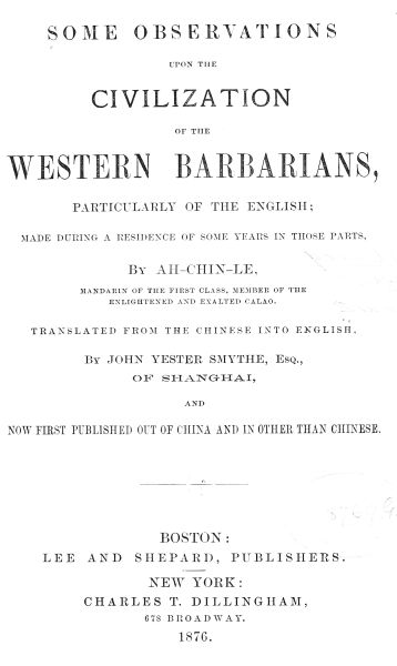 The Translator has been so absorbed in his Author, that he fears he may have often slipped in his Syntax, and been rude in his manner. However, with whatever faults, he hands the volume to his Countrymen—thinking that they may be as much interested in it as he has been; and may derive as much amusement. If it do not commend itself for its Wisdom, it may, at least, for its novelty—that is, as a genuine expression of intelligent Chinese opinion, concerning the "Civilization of the Western Barbarians, and particularly of the English."
