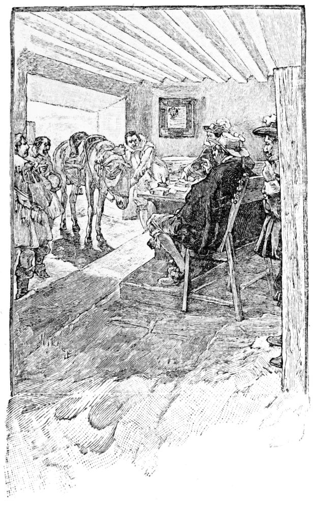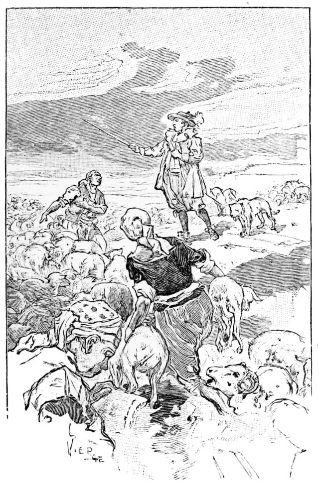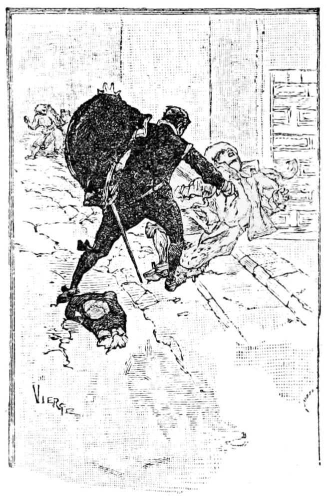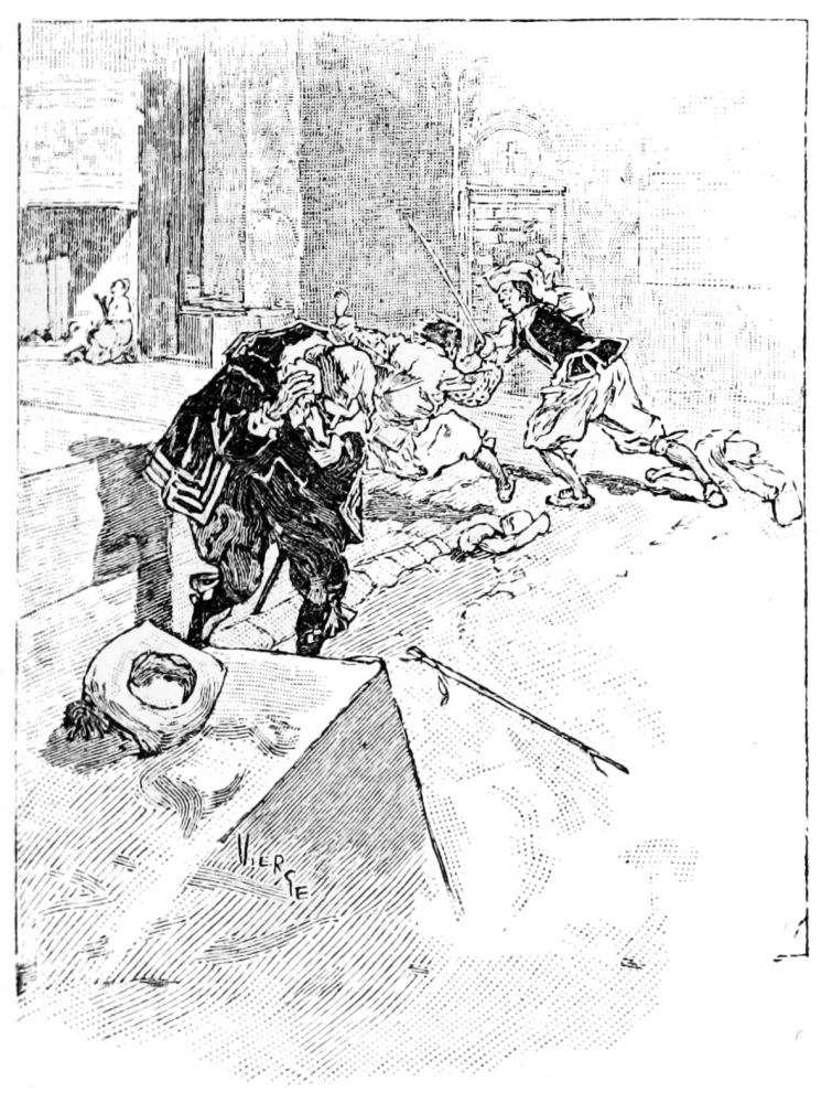 Un matin, vers les huit heures, j’étais,{30} dans ma boutique, à payer une lettre de change de mon maître de quelque vingt-quatre mille pesos, lorsque entra un nègre qui me dit:—Il y a à la porte des hommes qui ont l’air d’être armés de rondaches. Je pris l’alarme, dépêchai mon receveur après en avoir tiré reçu et envoyai querir Francisco Zerain. Il vint incontinent et reconnut les trois hommes qui se tenaient à l’entrée. C’étaient Reyes, avec son ami, celui que j’avais couché d’une estocade à Saña, et un autre. Après avoir recommandé au nègre de clore la porte, nous sortîmes dans la rue. Aussitôt ils nous chargèrent. Nous les reçûmes et, nous escrimant, ma malechance voulut que j’allongeasse, je ne sais où, un coup de pointe à l’ami de Reyes. Il tomba. Nous continuâmes à batailler deux contre deux, avec du sang.