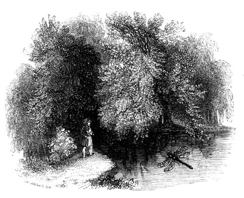 Then the breeze began to sigh among the tree-tops. The Child raised his eyes and saw overhead the quivering[62] green, and the deep blue behind it, and he knew not whether he were waking or dreaming: which were the real leaves and the real heaven,—those in the depths above, or in the depths beneath? Long did the Child waver, and his thoughts floated in a delicious dreaminess from one to the other, till the dragonfly flew to him in affectionate haste, and with rustling wings greeted her kind host. The Child returned her greeting, and was glad to meet an acquaintance with whom he could share the rich feast of his joy. But first he asked the dragonfly if she[63] could decide for him between the Upper and the Nether—the heighth and the depth? The dragonfly flew above, and beneath, and around; but the water spake: “The foliage and the sky above are not the true ones: the leaves wither and fall; the sky is often overcast, and sometimes quite dark.” Then the leaves and the sky said, “The water only apes us; it must change its pictures at our pleasure, and can retain none.” Then the dragonfly remarked, that the heighth and the depth existed only in the eyes of the Child, and that the leaves and[64] the sky were true and real only in his thoughts; because in the mind alone the picture was permanent and enduring, and could be carried with him whithersoever he went.