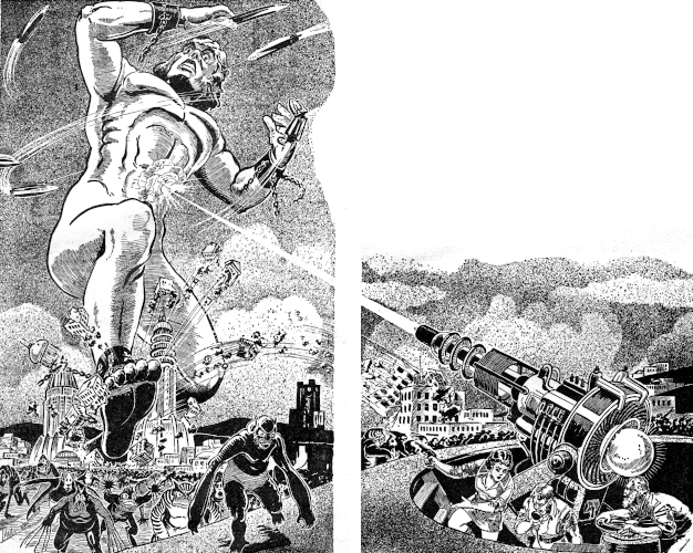Russell needed no explanation of his agonized words. For he, too, saw the climax of that frightful action. Colossus had climbed completely over the horizon, now. There was no doubt he had spotted the city. He seemed fascinated by its twin towers. Like a destructive child experimenting with some new toy he leaned over, gripped the spire of the nearest between a massive thumb and forefinger ... and snapped it off!