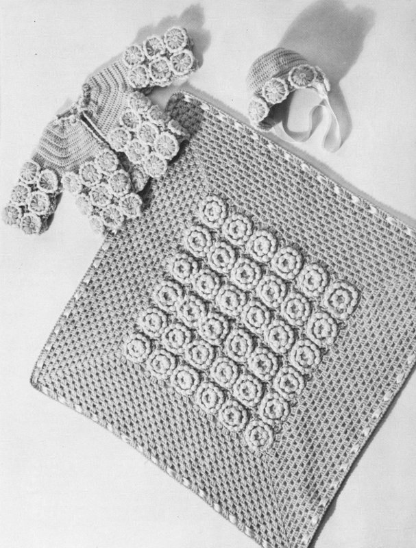 TO MAKE DAISIES: Make 62 daisies (57 for sacque, 5 for cap) following directions on page 3. Use A for petals and B for sewing centers, winding A 3 times around each spoke.
